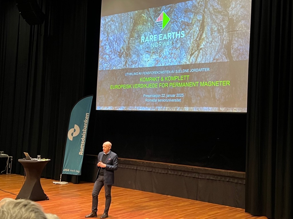 En fullsatt sal var svært begeistret over foredraget til Alf Reistad i Romsdal Senioruniversitet 22. januar. Rare Earths Norway (REN) er eid 95% av Steinsvik gjennom Hustadlitt-konsernet. Deres arbeid med å realisere en utvinning av “sjeldne jordarter” i Fensfeltet i Telemark, som er Europas største funn av slike mineraler, blir fulgt tett av toppolitikere og industriledere globalt. Grunnen er at “sjeldne jordarter”/mineraler er helt sentrale i det grønne skiftet, i nesten alle tekniske produkter og forsvarsmateriell. Idag har Kina et tilnærmet monopol for dette på verdensmarkedet. “Sjeldne jordarter” er egentlig en fellesbetegnelse for 17 forskjellige metaller som kommer fra jordas indre. Faktisk eksisterer de mange steder i naturen, men i Fensfeltet er de så konsentrert at det er mulig å utvinne dem. Det er et svært stort og krevende prosjekt, tekninsk og finansielt. Det utvikles et konsept for en underjordisk, autonom og bærekraftig utvinning. Målet er å være i drift med et pilotprosjekt i 2026. Alle partier på Stortinget, med unntak av Rødt, støtter prosjektet. Det at Fensfeltet nylig ble nominert som et strategisk prosjekt under det internasjonale Minerals Security Partnership (MSP), gjør at prosjektledelsen blir invitert inn til møter på et meget høyt nivå, både i EU og i andre fora. Det blir spennende å følge prosjektet videre.